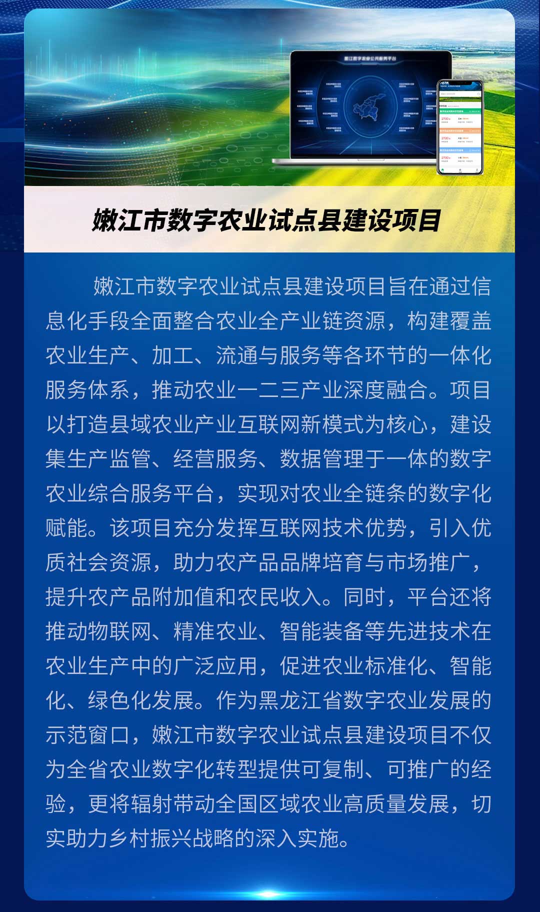 嫩江市数字农业试点县建设项目不仅为全省农业数字化转型提供可复制、可推广的经验,更将辐射带动全国区域农业高质量发展,切实助力乡村振兴战略的深入实施。